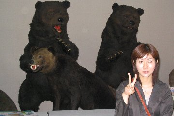 その後まだまだ続く大雨の中、白老町内で国道沿いにある土産物屋で熊たちが迎えてくれたので記念撮影。