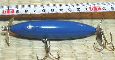 大きい方はのボディーのサイズは、写真の通りだいたい10cm(4”)でウェイトは、5/8ozちょうど良いサイズですよね。しかし、味も素っ気もない塗装だよね。何で? |